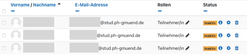 Studierende, die sich im Anschluss an eine Zulassung in LSF von einer Veranstaltung abmelden, werden in Moodle als inaktiv angezeigt.